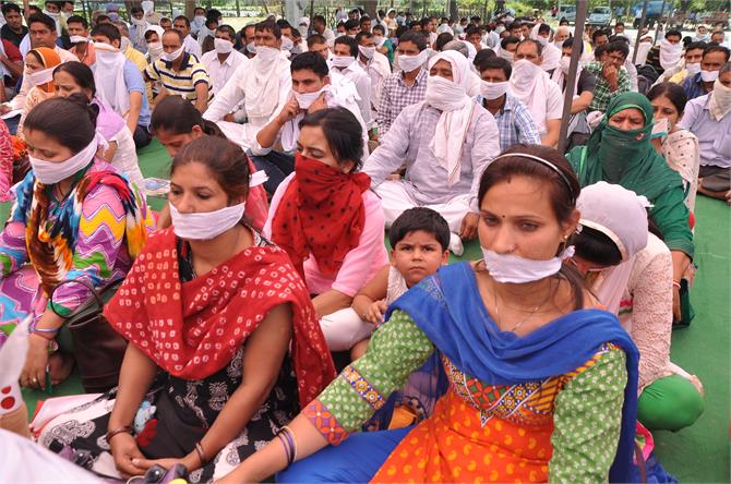 पंचकूला, (संजय): पंचकूला के सैक्टर-5 स्थित हैफेड ग्राऊंड में धरने पर बैठे जे.बी.टी. टीचरों ने जॉइनिंग लैटर नहीं मिलने के विरोध में आज पात्र अध्यापक संघ के बैनर तले 3 घंटे मौनव्रत रखा। मौनव्रत शुरू होने के बाद चुप्पी साधे बैठे जे.बी.टी. टीचरों के बीच एक पर्ची घुमाई गई, जिस पर लिखा था कि जो भी पहले बोलेगा, उसे 500 रुपए जुर्माना देना होगा। सैंकड़ों टीचर मौनव्रत पर तीन घंटे तक बिना बोले बैठे रहे।
